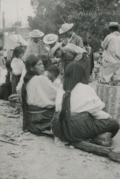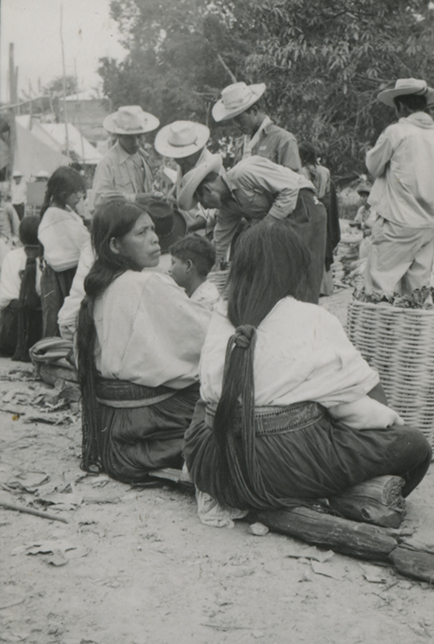 Mujeres Mixes provenientes de la comunidad de Tamazulápam, en la fiesta de Ixcuintepec, Oaxaca. Sentadas sobre un tronco de madera. Visten huipil (blusa) de algodón tejido en telar de cintura, de tres lienzos unidos verticalmente, este va metido en el enredo (falda); el cual tiene muchos pliegues y va sostenido a la cintura por una faja, tejida también en telar de cintura con motivos brocados de danzantes. El cabello recogido hacia atrás y sujeto por unos tlacoyales de lana. Junto a ellas un grupo de hombres con sombrero, revisando algo dentro de los canastos de carrizo.