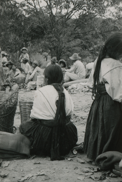 En esta imagen se aprecia una mujer mixe de Tamazulápam, sentada sobre un tronco de madera de espaldas a la cámara. Viste un huipil (blusa) amplio, que se compone de tres lienzos unidos verticalmente por randas, tejido en telar de cintura y el cual está metido en el enredo(falda), que se sostiene a la cintura por una faja, unas cintas anudadas al cabello complementan su indumentaria. Al lado derecho vista parcial de una niña vistiendo de la misma manera, y al fondo de la imagen varios marchantes, vistiendo manta y la mayoría con sombreros de fieltro.