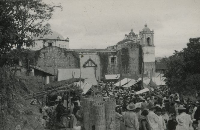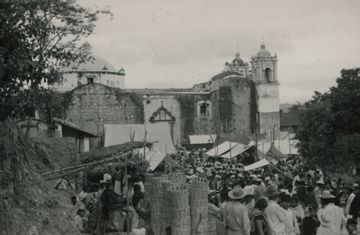 Lugareños y pobladores de comunidades vecinas, se congregan para celebrar la fiesta de la Purísima Concepción en la localidad mixe de Santiago Ixcuintepec, Oaxaca. Al fondo se observa una vista lateral de la iglesia, cuya construcción se inició en 1721.