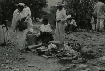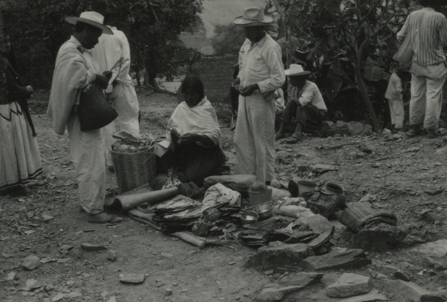 Mixes provenientes de la comunidad de Tamazulápam, vendiendo sus productos en la fiesta de Ixcuintepec, Oaxaca. Sobre el petate se pueden aprecian sus productos, pescado seco, ajos, etc. Su interlocutor de pie, viste calzón y camisa de manta, lleva un sombrero de palma y en el hombro una cobija, bajo el brazo, un morral tejido en telar de cintura, este es de lana, en sus manos sostiene unos ajos.