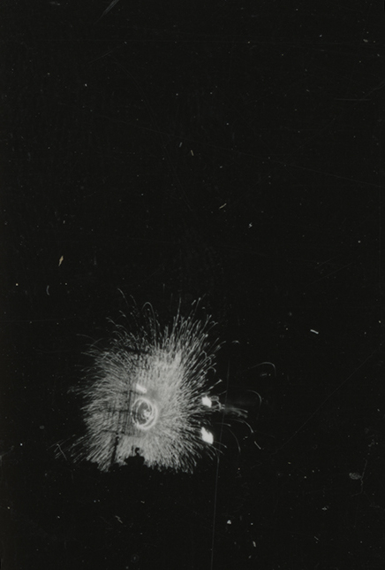 Quema de los fuegos artificiales en el castillo con estructura de carrizo, lugareños y peregrinos observando el espectáculo. Víspera del 8 de diciembre de 1953, en Ixcuintepec, Oaxaca.