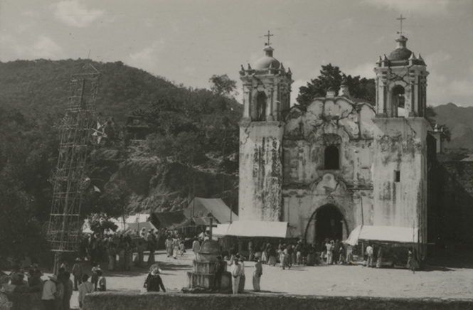 Fachada de la iglesia en Santiago Ixcuintepec, Oaxaca, a la izquierda de la imagen, en el atrio, se aprecia el castillo. La estructura principal de este, es un tronco de madera y sostiene a su alrededor la estructura de carrizo donde se colocan los fuegos artificiales. Dicho castillo se encendía la víspera de la fiesta a la Purísima Concepción.