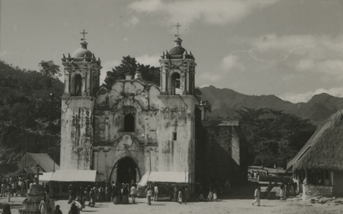 Fachada de la Capilla de la Santa Cruz de Santiago Ixcuintepec, Oaxaca. Arquitectura religiosa de tipo colonial, con una entrada en arco de medio punto y pilastras a los lados, con sus campanarios en los extremos y un amplio atrio al frente, en uno de los costados se observan los contrafuertes. En 1721 se inició la obra de construcción y se concluyó en 1749. Al lado derecho de la imagen se aprecia parte de una construcción con paredes de adobe y techo de palma. Lugareños y visitantes congregados en el atrio de la iglesia.