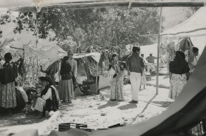 Joven mujer cargando un bebé con la ayuda de un lienzo, el cual está anudado a la altura del pecho, viste un huipil (blusa) corto con bordados de flores y una falda de tela industrial, frente a ella un hombre vistiendo ropa de tipo industrial. Son peregrinos que acuden a la celebración de la fiesta de la Purísima Concepción en Santiago Ixcuintepec, Oaxaca.