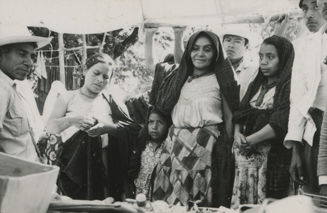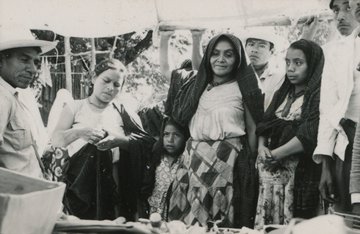 Mujeres mixes probablemente provenientes de Margaritas (de acuerdo a la autora). En la feria de Santiago Ixcuintepec, Oaxaca. Las dos mujeres adultas visten blusas de manta industrial con bordados hechos con máquina, compuesta de varias piezas, llevan faldas de pretina de tela industrial y una de ellas se cubre la cabeza con un rebozo. Personas a su alrededor visten ropa de tipo industrial.