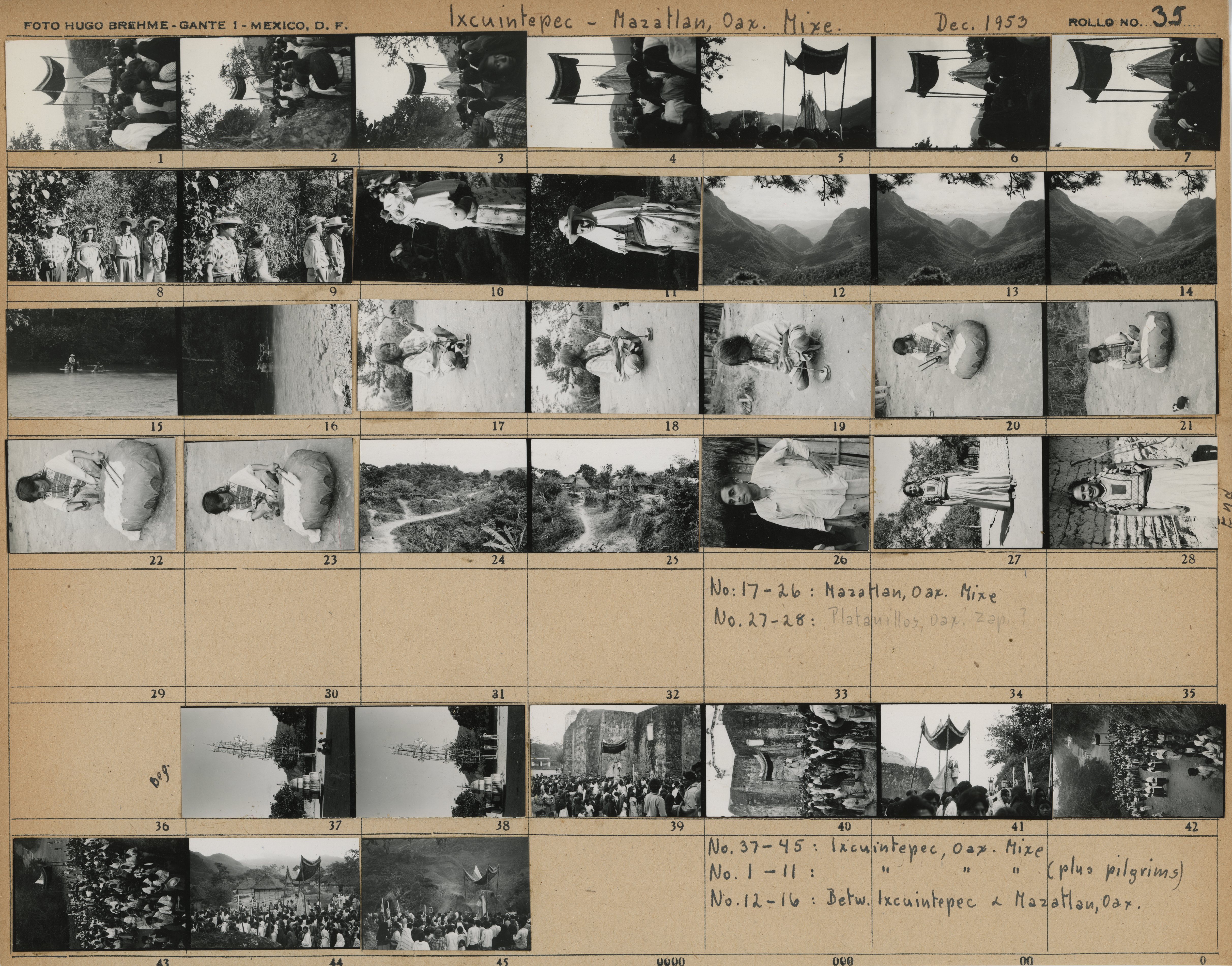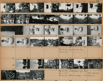 Hoja de papel cartulina comercial, en la que se encuentran pegadas 37 imágenes del viaje realizado por la autora y colaboradores en los meses de noviembre y diciembre de 1953.