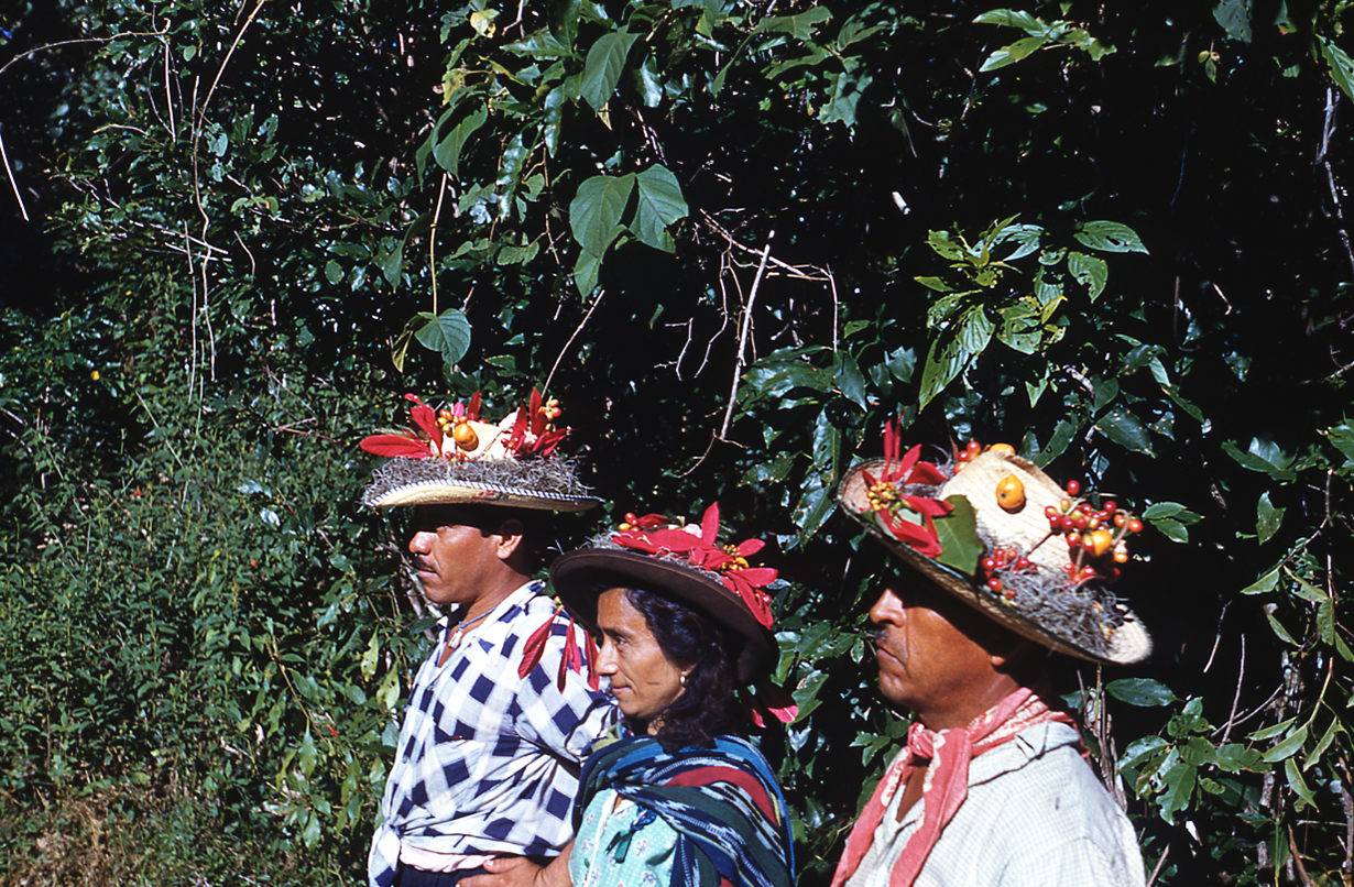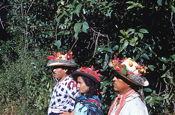 Peregrinos del Istmo de Tehuantepec, regresando a su comunidad de origen, después de la fiesta de la Purísima Concepción, en la comunidad mixe de Santiago Ixcuintepec, Oaxaca. Ellos suelen adornar sus sombreros con musgo alrededor de la copa y sobre este, flores de noche buena (Euphorbia pulcherrima), muérdago y "tejocotes" (manzanitas).