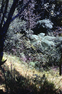 Casi al centro de la imagen se observan las ciateáceas (Cyatheaceae) de la familia de los helechos. Imagen tomada en el trayecto de Mazatlán con dirección a Platanillos, Oaxaca.