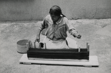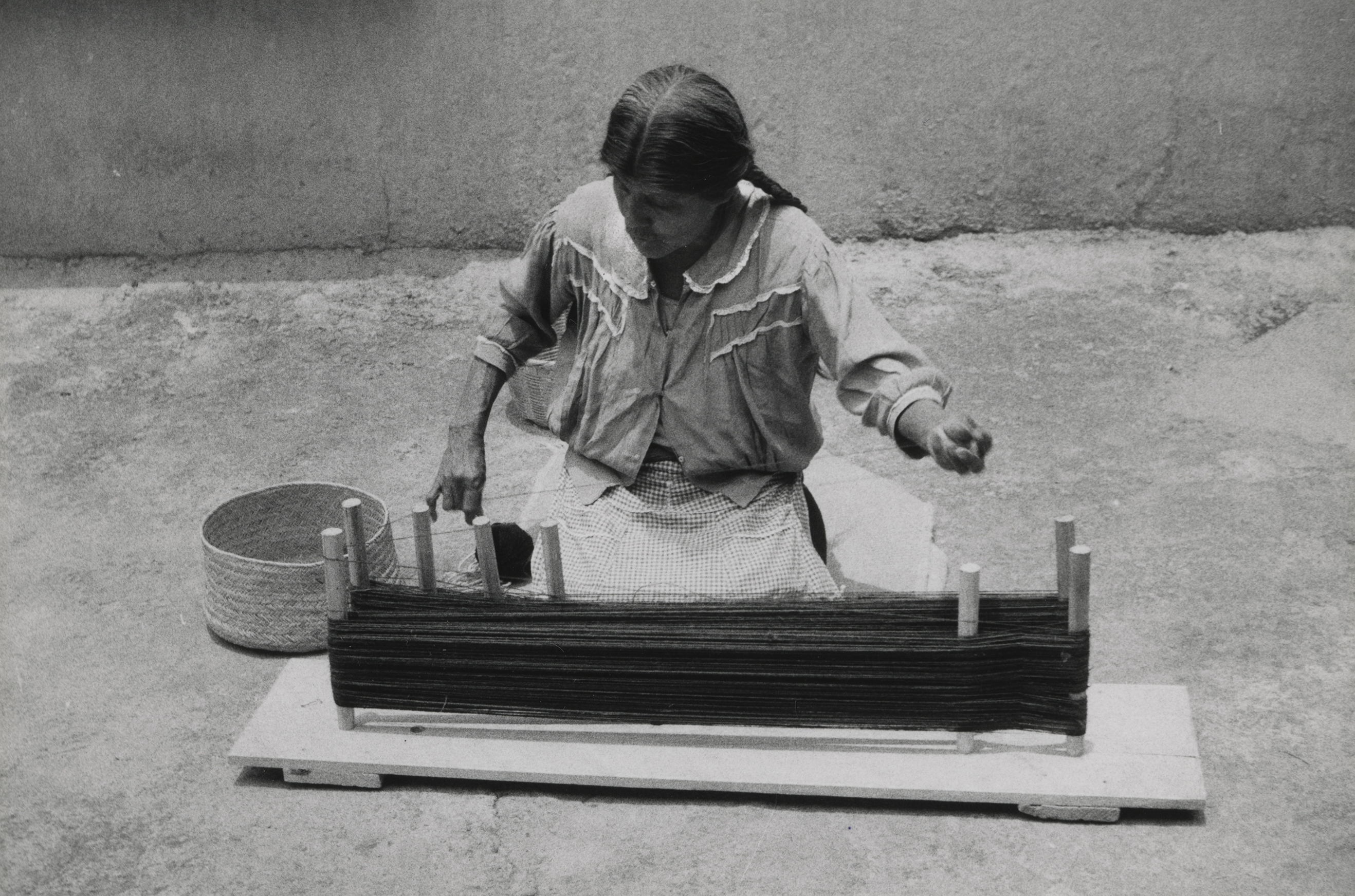 Doña Lorenza, mujer zapoteca originaria de Mitla, Oaxaca, sentada de cuclillas, prepara los hilos en la urdidera para después ser pasados al telar. Cuando el lienzo es largo utilizan las ocho estacas que se ven en el urdidor, ella ordena los hilos por colores de acuerdo al diseño que desea.