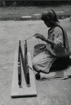 En la imagen se observa un urdidor de forma rectangular sobre el piso, con una base de madera y tiene insertados 8 piezas de madera de forma cilíndrica, entre las cuales se aprecian los hilos que Doña Lorenza, mujer zapoteca originaria de Mitla, Oaxaca, sentada de cuclillas frente al urdidor va entrelazando.