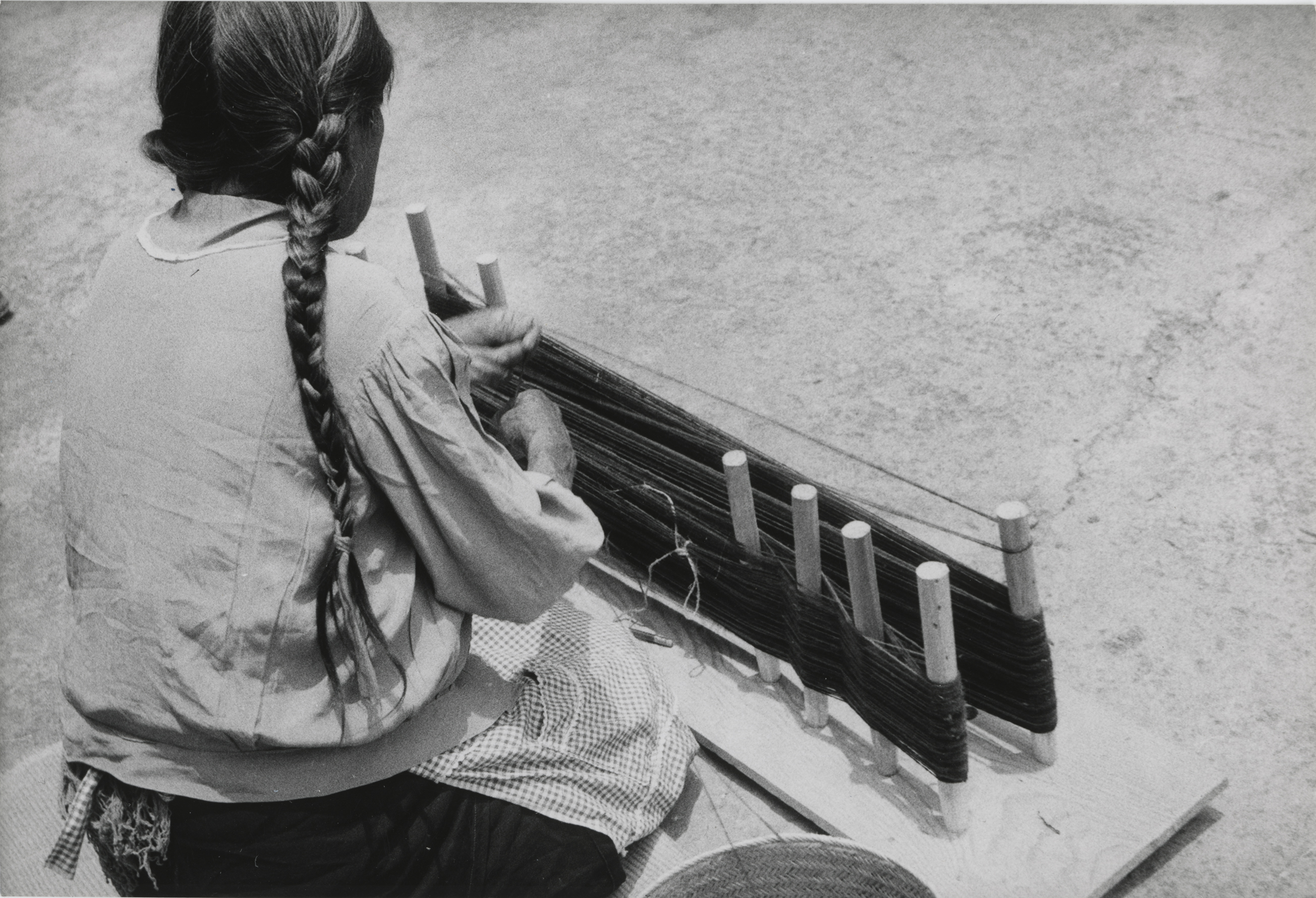 Doña Lorenza, zapoteca originaria de Mitla, Oaxaca, sentada de cuclillas entrelazando los hilos en el urdidor, entre las primeras dos estacas se aprecia la selección de hilos de color claro que forman una cruz, entre la segunda, tercera y cuarta estacas selecciona todos los hilos para formar dos cruces, después de la cuarta estaca tiene seleccionados unos hilos los cuales están amarrados con un hilo de color más claro. Fotografía en buen estado de conservación.