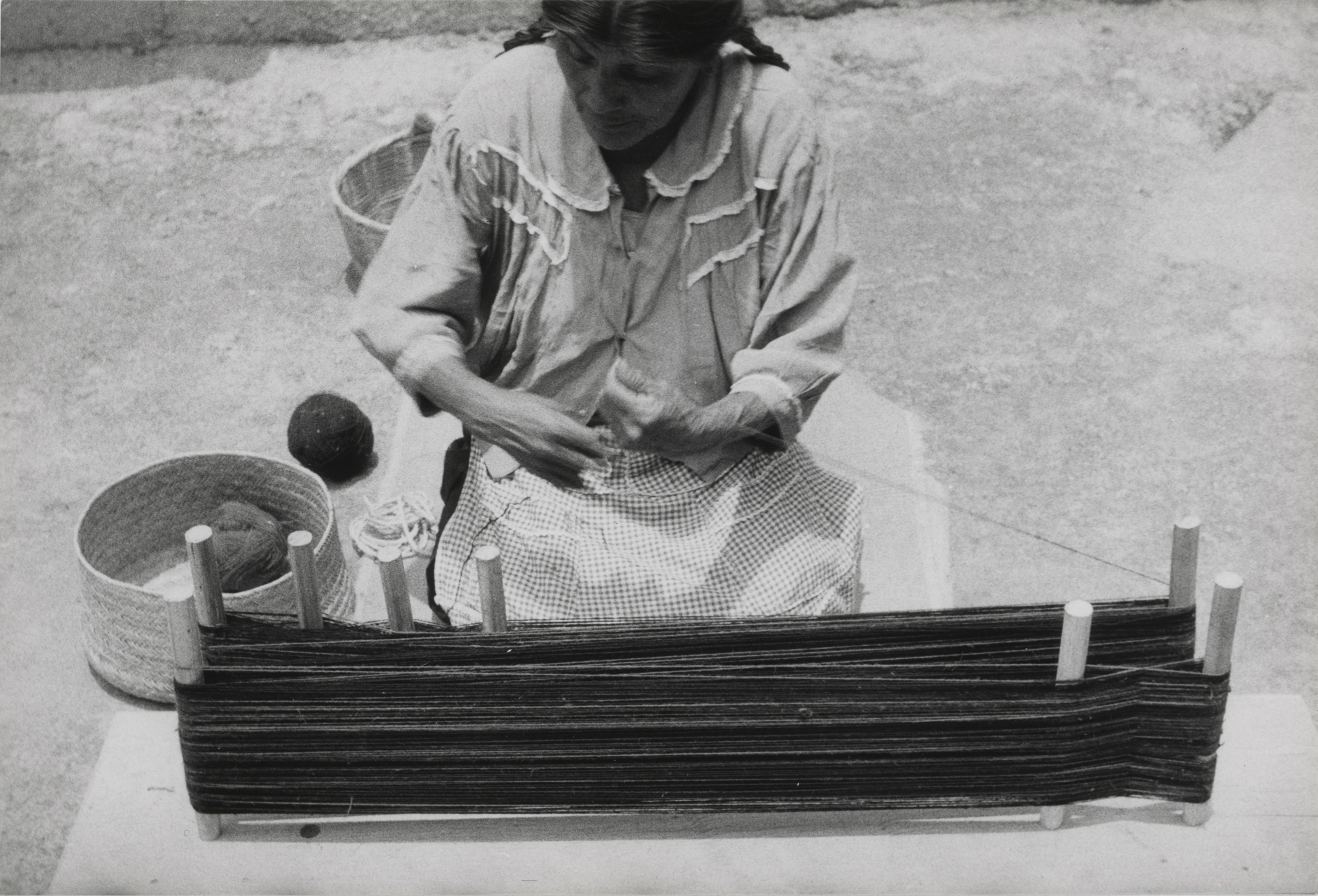 Doña Lorenza, sentada de cuclillas, acomodando los hilos en el urdidor, junto a ella, en el interior de un canasto hecho de palma y sobre el suelo unas madejas de hilos.