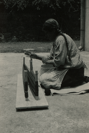 Doña Lorenza se encuentra sentada de cuclillas sobre una cobija, entrelazando los hilos en una urdidora, ella es originaria de Mitla, Oax. La hoja de contacto está pegada a una hoja de papel cartulina comercial y presenta muchos rayones superficiales.