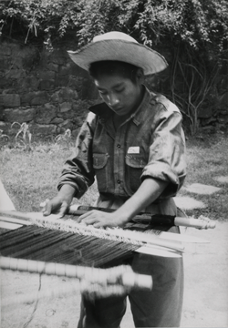 Niño zapoteco de 14 años de edad, bisnieto de Doña Lorenza, tejiendo en telar de cintura un lienzo para enredo (falda). El es originario de Mitla, Oaxaca.