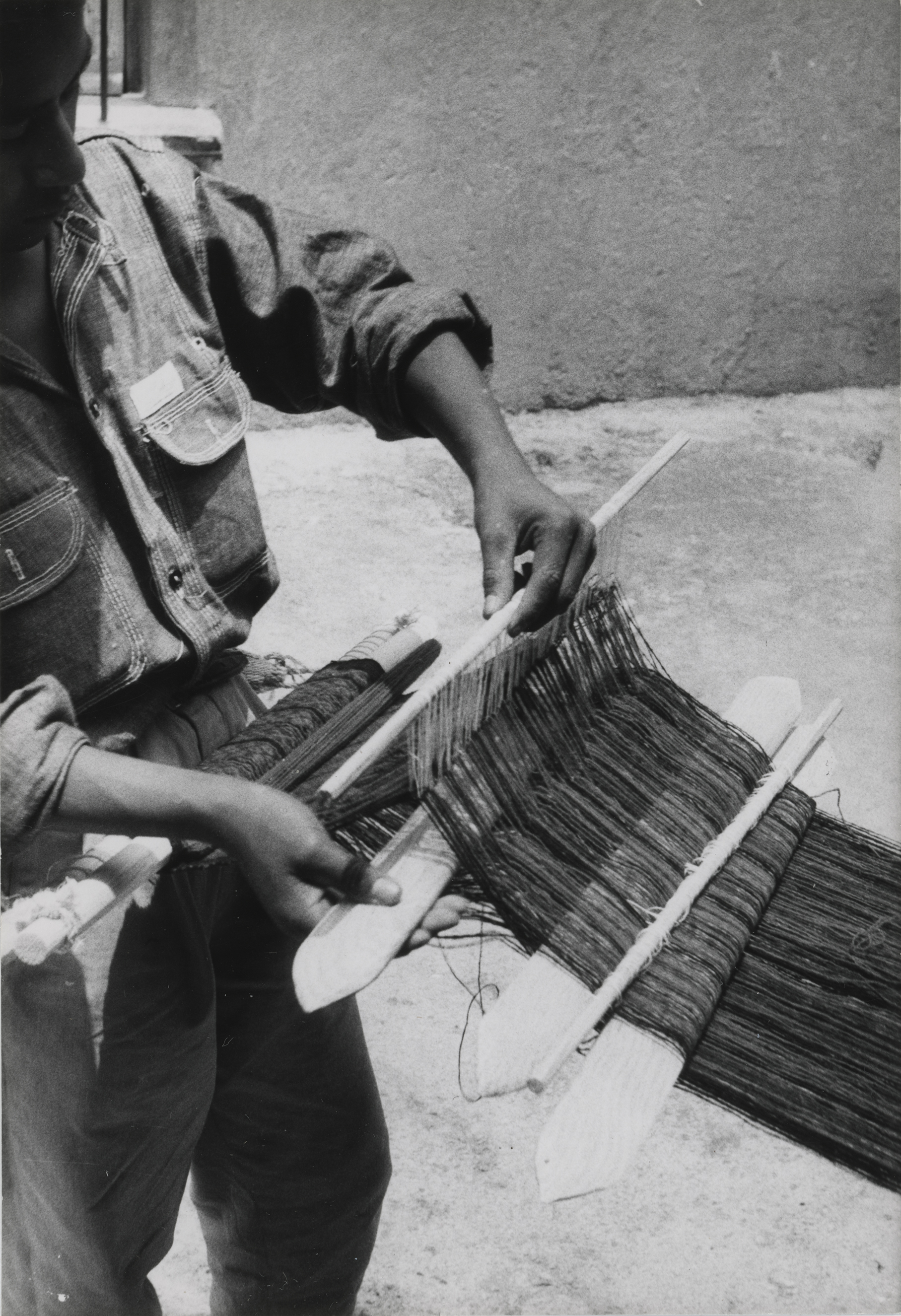En la imagen un niño de catorce años de edad, tejiendo en telar de cintura un lienzo para enredo (falda), con la mano izquierda levanta la vara de lizo, y con la derecha introduce el machete en el espacio que se ha creado al levantar la vara de lizo. El tejedor se encuentra de pie, es originario de Mitla, Oaxaca y es el bisnieto de Doña Lorenza. Fotografía en buen estado de conservación.