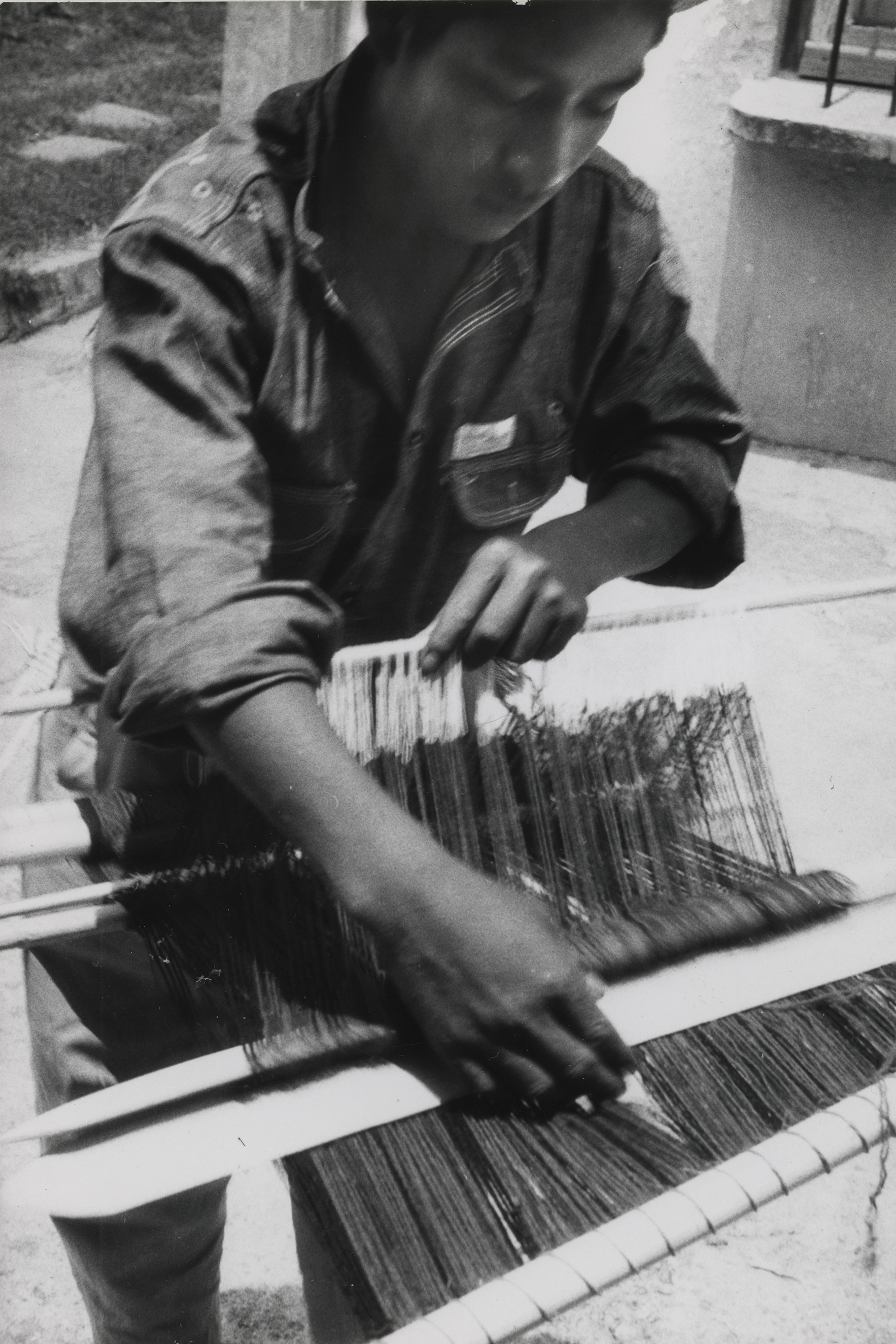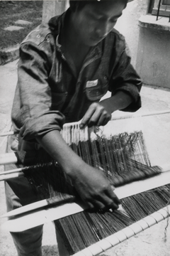 El tejedor levanta con la mano izquierda la vara de lizo, y con la mano derecha sostiene el machete. El niño de catorce años de edad es zapoteco, originario de Mitla, Oaxaca y es el bisnieto de Doña Lorenza. Fotografía en buen estado de conservación.