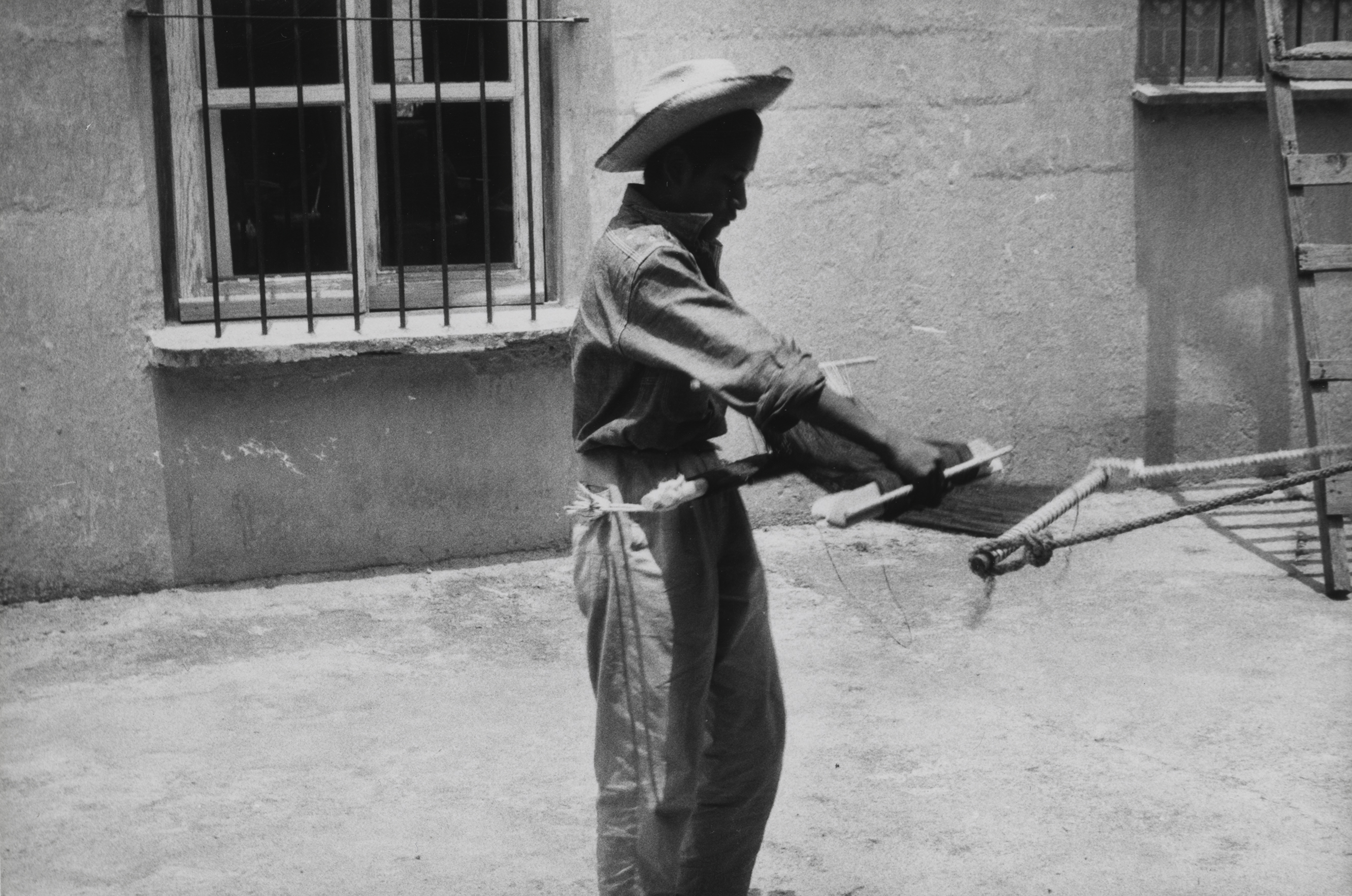 Tejiendo de pie, un lienzo para enredo (falda), el bisnieto de Doña Lorenza, originario de Mitla, Oaxaca.