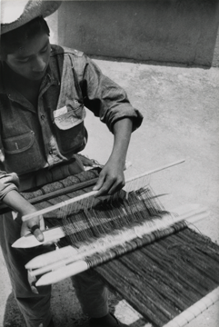 Niño zapoteco de catorce años de edad, tejiendo de pie en telar de cintura un lienzo para enredo (falda). Originario de Mitla, Oaxaca, es bisnieto de Doña Lorenza.