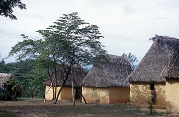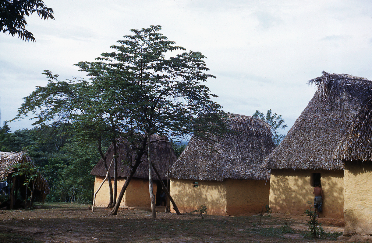 "Las casas de Cosoleacaque son pequeñas y rectangulares. Sus paredes se forman con varas entretejidas y embadurnadas nítidamente de barro entre rosa y naranja. Los techos de paja son de dos aguas y se apoyan en horquillas verticales, postes y bambú y el espacio creado en su interior se aprovecha como almacén. Dos puertas alineadas frente a frente y una ventana cuadrada dan la ventilación necesaria." Diapositiva en buen estado de conservación.