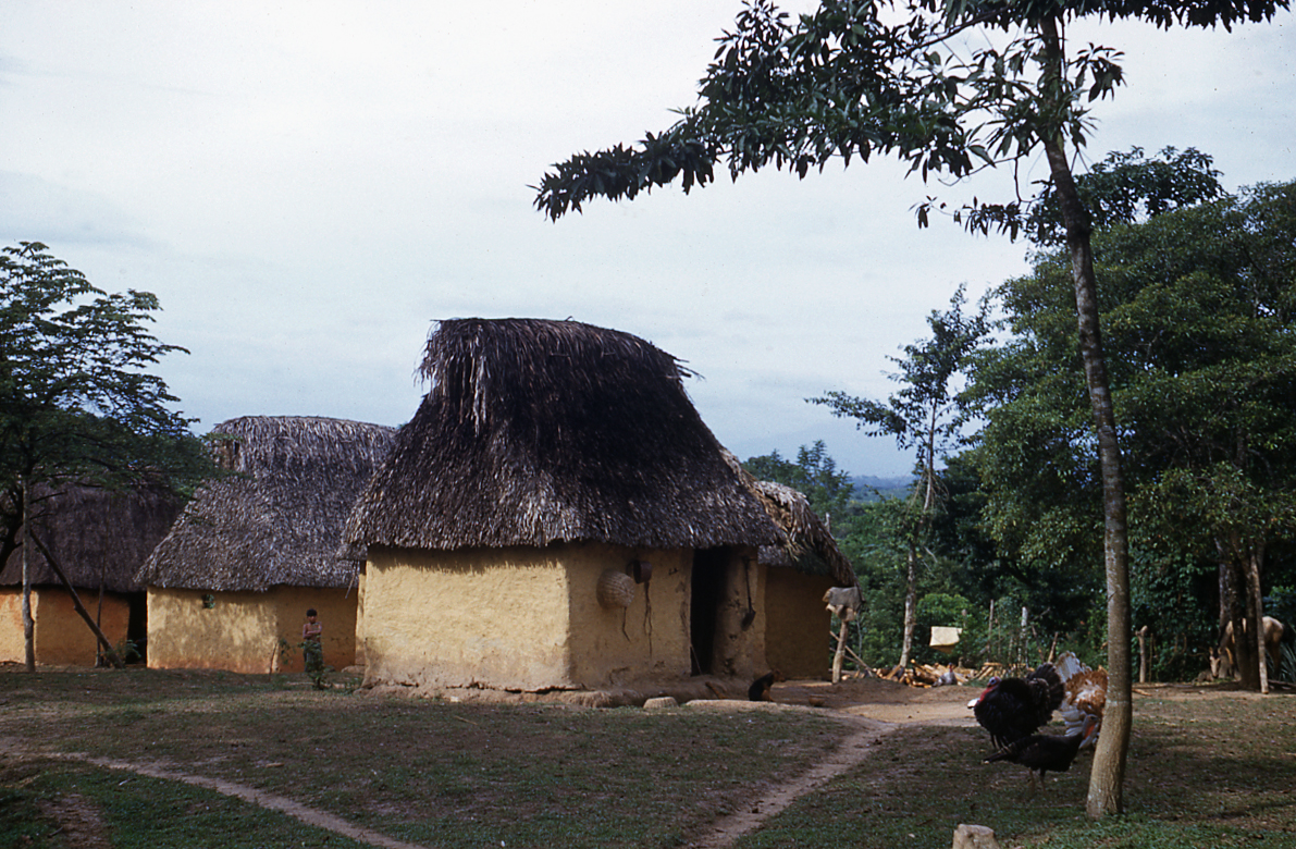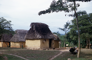 Conjunto de habitaciones con paredes recubiertas de arcillas y techos de palma, unos guajolotes en actitud de cortejo.