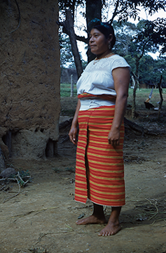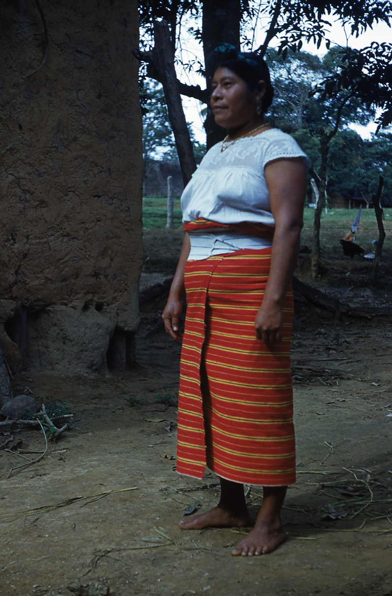 Mujer nahua de Cosoleacaque, Veracruz. Viste "una falda enrollada de tela tejida a mano con rayas amarillas, rojas, negras y blancas. La falda se sostiene en la cintura mediante una tiesa cinta acanalada de manufactura local de tejido complicado y que, muchas veces, se adornan espléndidamente con figuras geométricas y de animales. Arreglan el pelo con dos trenzas entrelazadas de listones rojos, los cuales se cruzan por la nuca y se pasan por la cabeza hacia adelante, donde se hace un moño." "Las mujeres de Cosoleacaque usan blusas con punto tejido a crochet, o con diseños bordados en punto de cruz" Diapositiva en buen estado de conservación.