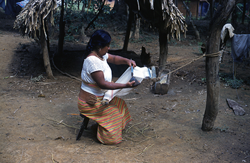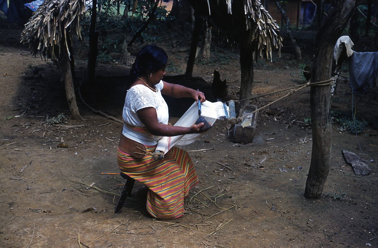 Tejedora nahua de Cosoleacaque, Veracruz, tejiendo en telar de cintura, una servilleta con brocado de trama. Ella está sentada sobre un banco de madera, levanta con la mano izquierda la vara de lizo y en el espacio que se genera al hacer este movimiento, introduce el machete, el cual sostiene con la mano derecha. Un extremo del telar se encuentra amarrado a un tronco de árbol y el otro extremo, sujeto a la cintura de la tejedora por un cinturón de piel. Viste un enredo (falda) con diseños de líneas en color rojo, amarillo, negro y blanco, se sujeta a la cintura por un ceñidor de textura acanalada en color blanco con líneas en color negro. Lleva una blusa color blanco de cuello amplio con motivos florales al contorno del cuello y las mangas. complementa su indumentaria con un collar de cuentas, aretes y el cabello trenzado recogido hacia atrás.Diapositiva en buen estado de conservación.