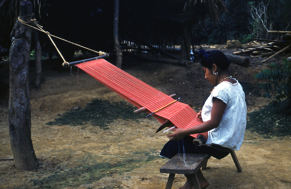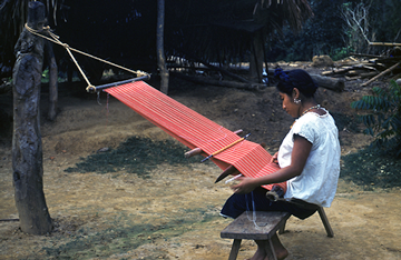 Mujer nahua de Cosoleacaque, Veracruz, sentada sobre un banco de madera, tejiendo en telar de cintura, un lienzo para enredo (falda) con diseño de líneas de urdimbre en colores rojo y blanco. El machete está en posición vertical dividiendo la urdimbre, generando un espacio por donde introduce la lanzadera o bobina con el hilo color blanco. Tiene parte del lienzo terminado en técnica de tafetán o tejido sencillo. Ella viste un enredo en color azul marino y una blusa de manta comercial, de cuello amplio con motivos fitomorfos alrededor del cuello y las mangas, lleva un collar de cuentas, aretes y el cabello entrelazado con listones de color azul, los cuales se cruzan en la nuca y pasan alrededor de la cabeza hacia adelante donde se anudan.Diapositiva en buen estado de conservación.