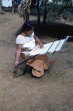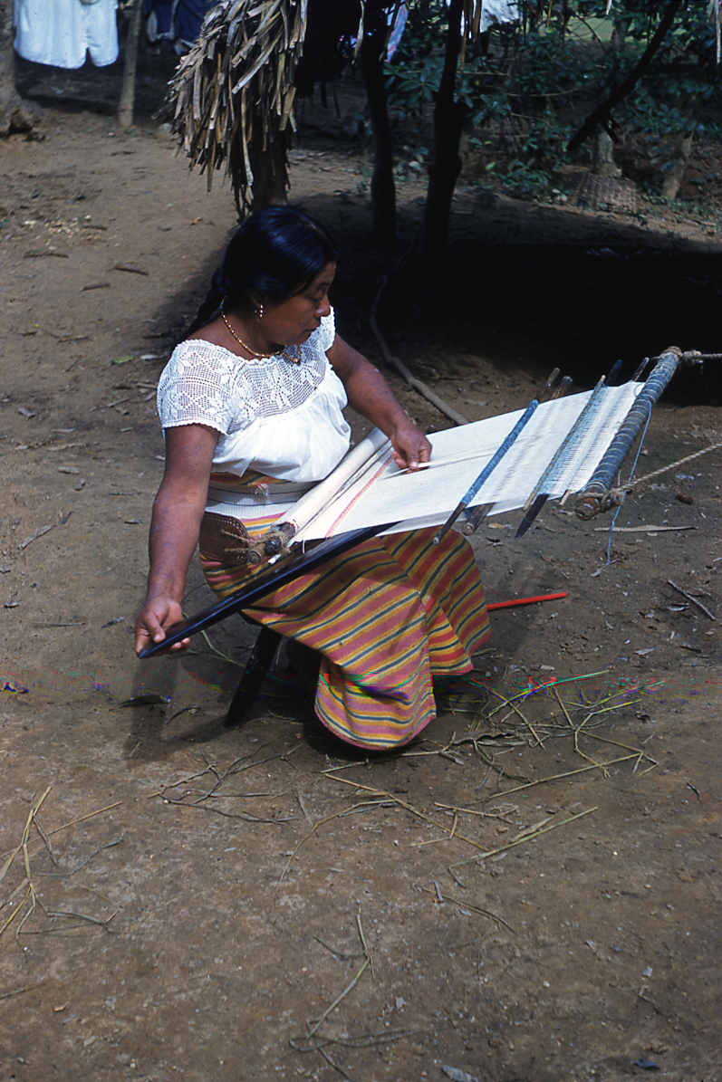 Tejedora nahua de Cosoleacaque, Veracruz, sentada en un banco de madera, tejiendo en telar de cintura, una servilleta con brocado de trama. Con los dedos pulgar, índice y medio, sostiene un grupo de hilos de la urdimbre, mientras que con la mano derecha sostiene el machete, el cual está separando los hilos de la urdimbre. La tejedora viste un enredo (falda) con diseño de franjas alternadas de colores: rojo, amarillo, blanco y negro, el cual se sostiene a la cintura por una faja de textura acanalada de color blanco con líneas en color negro, lleva una blusa de tela comercial con motivos fitomorfos al contorno del amplio cuello y las mangas, porta un collar de cuentas y aretes en forma de "canastita", el cabello recogido hacia atrás en trenzas.Diapositiva presenta rayones y franjas de distorsión de los colores.