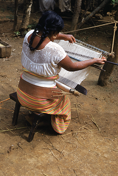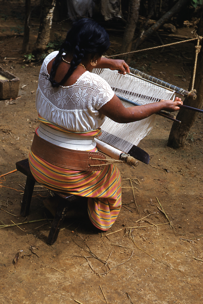 Tejedora nahua de Cosoleacaque, Veracruz. Sentada en un banco de madera, teje en telar de cintura una servilleta con la técnica de brocado de trama. Con la mano izquierda levanta una segunda vara de lizo, mientras que con la mano derecha introduce un segundo machete en el espacio que ha generado al levantar la vara de lizo. Ella viste un enredo (falda), que se compone de dos lienzos, unidos verticalmente, con diseños de franjas alternadas de colores: rojo, amarillo, blanco y negro, el cual se sostiene a la cintura por una faja de textura acanalada de color blanco con líneas en color negro, lleva una blusa de tela comercial con motivos fitomorfos al contorno del amplio cuello y las mangas, porta un collar de cuentas y aretes en forma de "canastita", el cabello recogido hacia atrás en trenzas. Se observa en los brazos de la tejedora, un tipo de psoriasis.Diapositiva en buen estado de conservación.