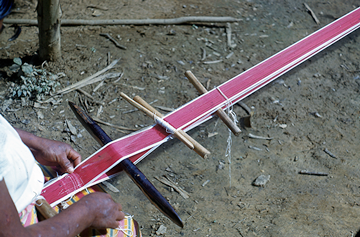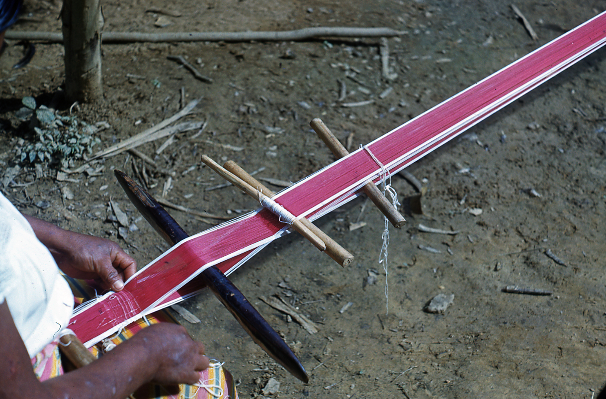Tejedora nahua de Cosoleacaque, Veracruz, tejiendo en telar de cintura una faja con la técnica de labrado de urdimbre. En este tipo de técnica, se agregan hilos extras, que van de forma paralela a los hilos de urdimbre que forman la estructura, esto para crear patrones y motivos. Nótese la psoriasis que presenta en los brazos la tejedora. Diapositiva en buen estado de conservación.