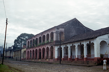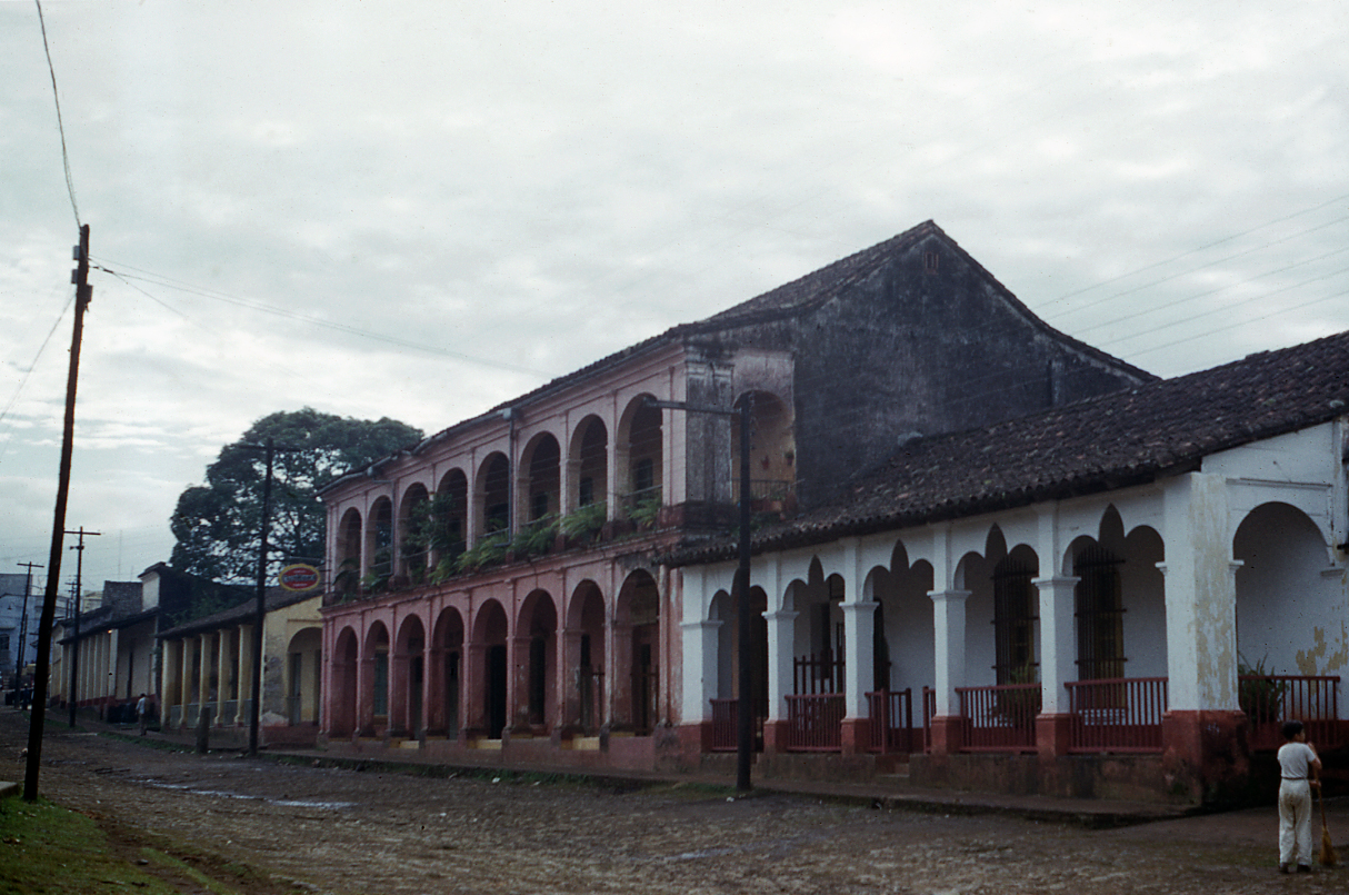 Una calle en San Andrés Tuxtla, en 1953. Influencia de la colonia en la arquitectura, los corredores de las casas con arcos de medio.