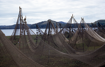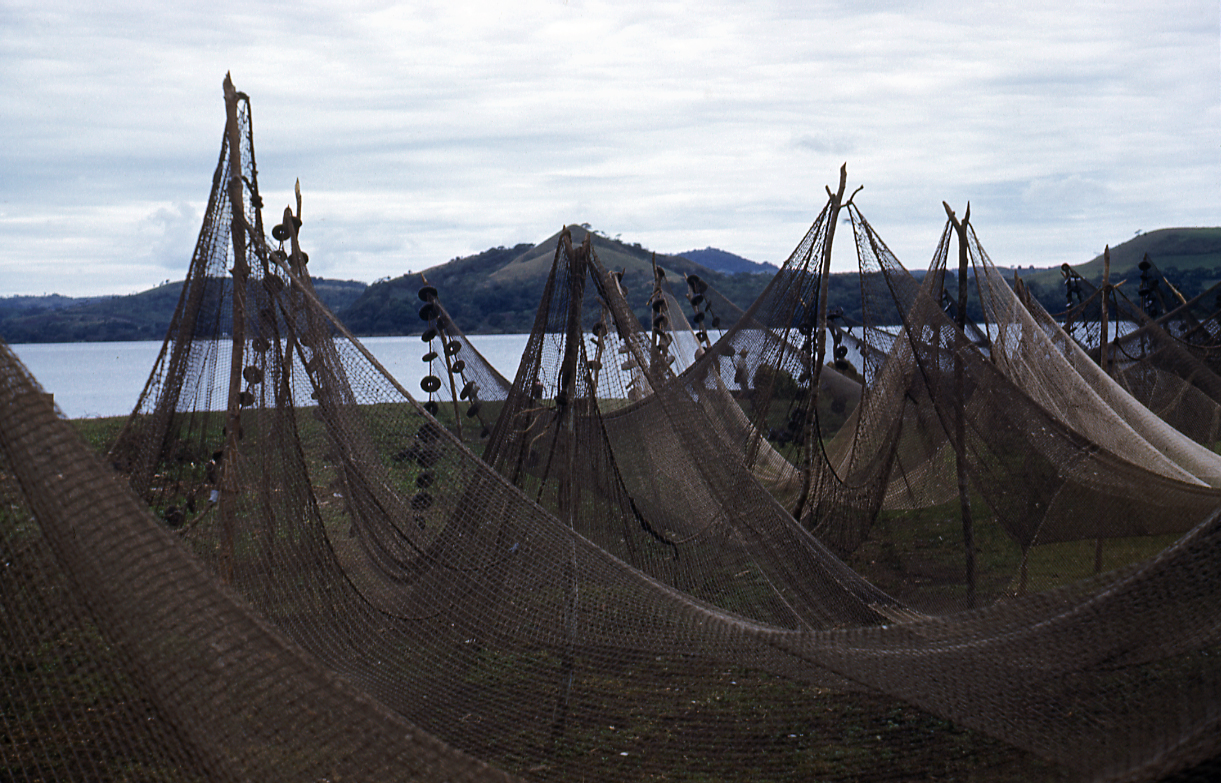 Redes para pesca en las riveras de la laguna de Catemaco, las cuales se encuentran soportadas por troncos de madera enterrados en la tierra, lleva en las orillas unos discos flotadores, estos suelen estar hechos de corcho o de suelas viejas de sandalias. Diapositiva en buen estado de conservación.