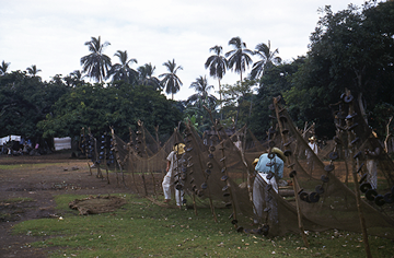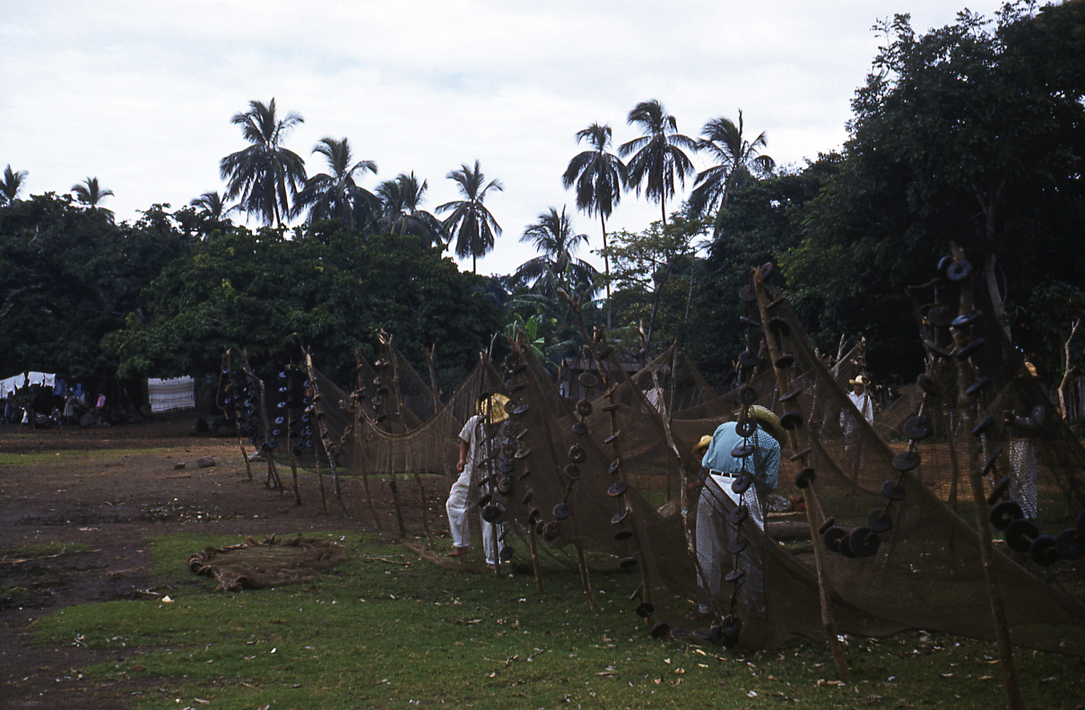Pescadores reparando sus redes para pesca. Visten pantalones blancos, camisa y el característico sombrero veracruzano de cuatro pedradas, llamado así por los huecos que tienen en la copa. Las redes se encuentran sostenidas por troncos de madera y se observan los flotadores en forma de discos, en los extremos. Diapositiva en buen estado de conservación.