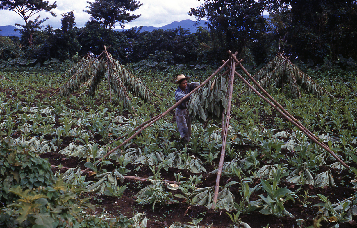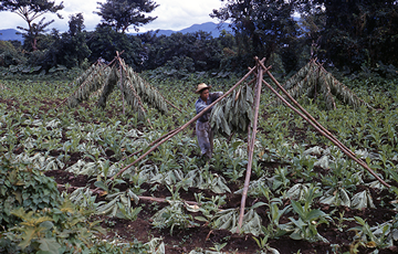 Plantío de tabaco en Catemaco, Veracruz, Un campesino cuelga manojos de hojas de tabaco para su secado en estructuras de forma piramidal hechas de troncos de madera, las cuales se encuentran dispersas en el plantío. Diapositiva en buen estado de conservación.