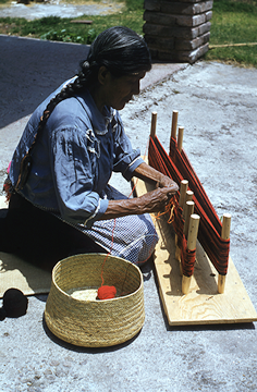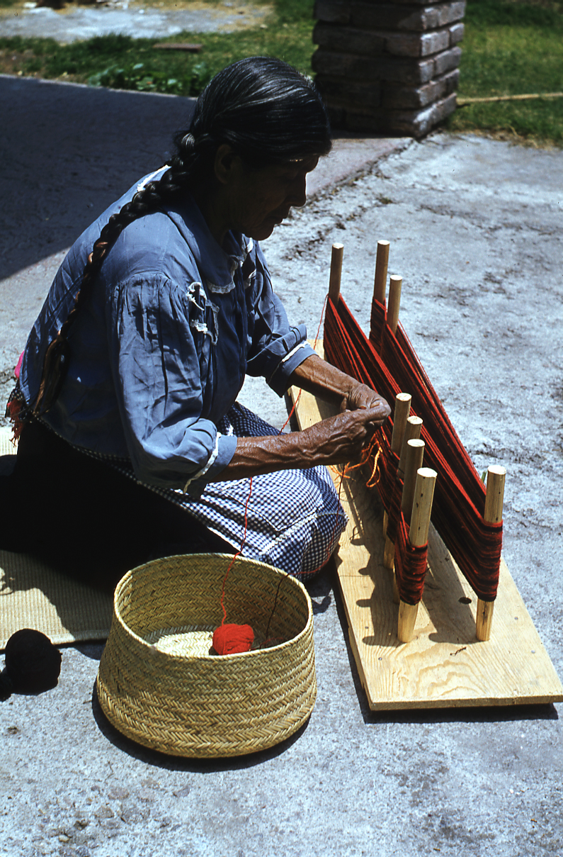 Doña Lorenza se encuentra sentada de cuclillas sobre una cobija, entrelazando los hilos en un urdidor, ella es originaria de Mitla, Oax.