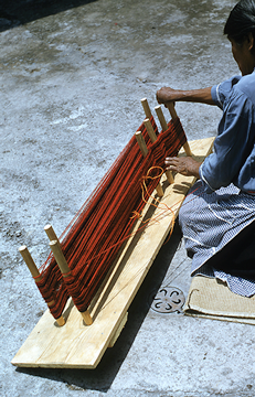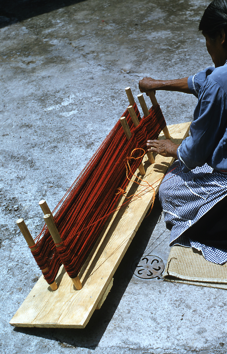 Doña Lorenza, mujer zapoteca originaria de Mitla, Oaxaca, sentada de cuclillas, prepara los hilos en el urdidor para después ser pasados al telar. Cuando el lienzo es largo utilizan las ocho estacas que se ven en la imagen, ella ordena los hilos por colores de acuerdo al diseño que desea. Diapositiva en buen estado de conservación.