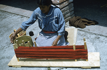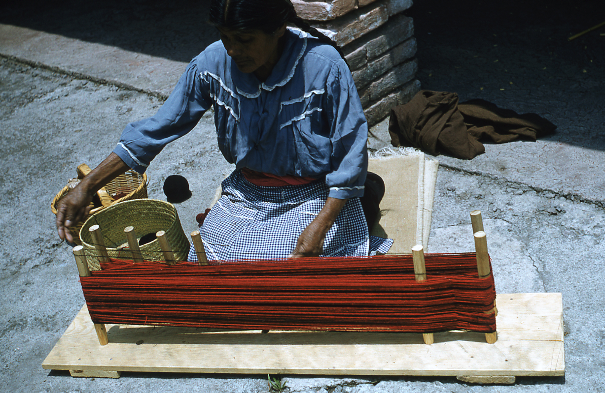 Doña Lorenza, mujer zapoteca originaria de Mitla, Oaxaca, sentada de cuclillas, prepara los hilos en el urdidor para después ser pasados al telar. Cuando el lienzo es largo utilizan las ocho estacas que se ven en la imagen, ella ordena los hilos por colores de acuerdo al diseño que desea. Diapositiva en buen estado de conservación.