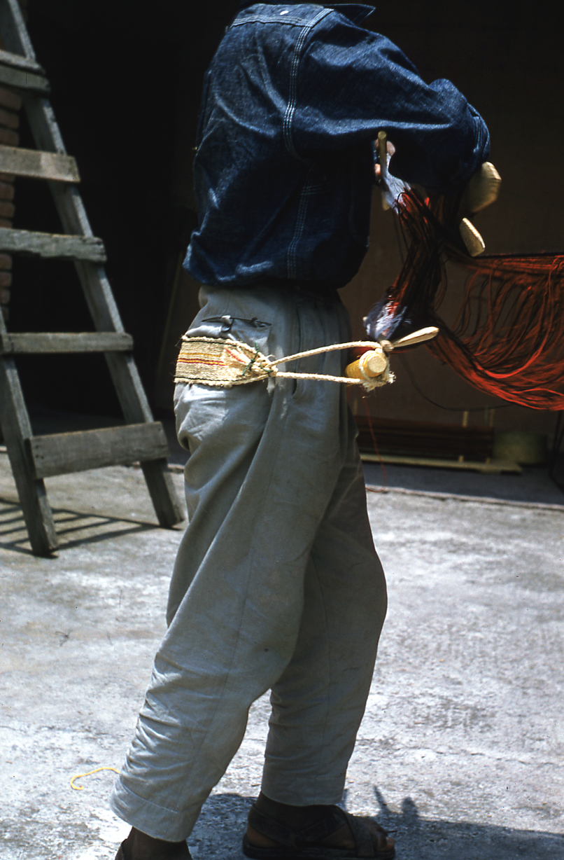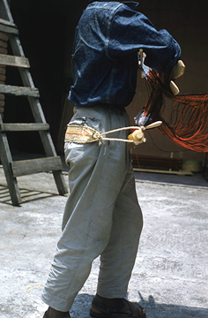 En la imagen un niño de catorce años de edad, tejiendo en telar de cintura un lienzo para enredo (falda). El tejedor se encuentra de pie, es originario de Mitla, Oaxaca y es el bisnieto (ahijado) de Doña Lorenza. Diapositiva en buen estado de conservación.