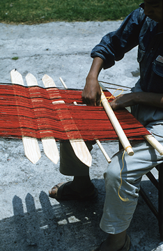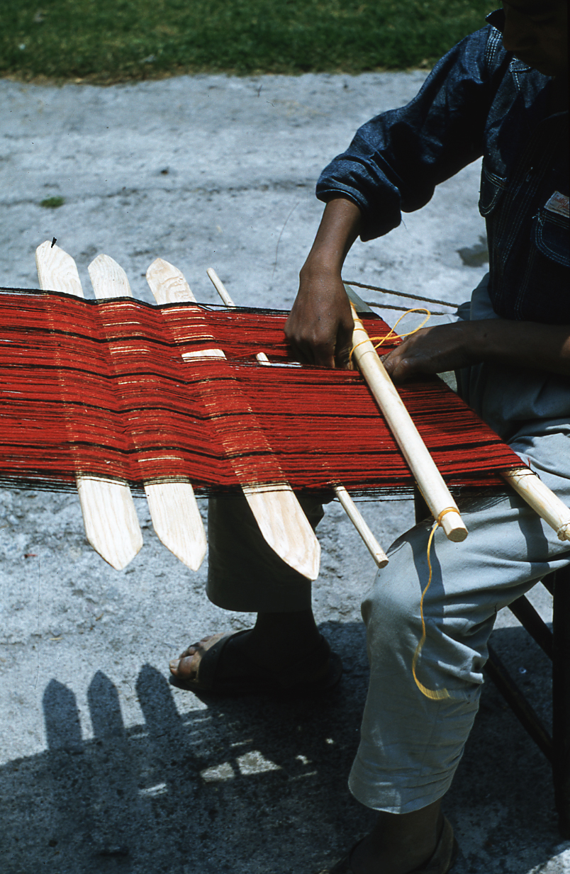 El bisnieto (ahijado) de Doña Lorenza, es originario de Mitla, Oaxaca, tiene catorce años de edad y está agrupando hilos de la urdimbre, a los cuales les pasa un cordel de color amarillo, y éste se sujeta al enjulio inferior el cual irá atado a un mecapal, que a su vez se sujeta a la cintura, se observan también los machetes que separan las cruces, este proceso llega a durar más de dos horas para tener listo el telar y comenzar a tejer. Diapositiva en buen estado de conservación.