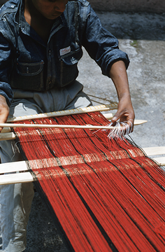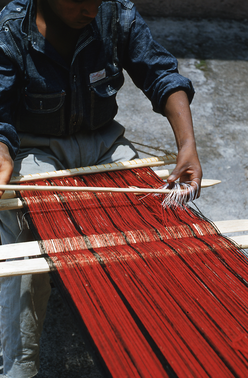 El bisnieto (ahijado) de Doña Lorenza, es originario de Mitla, Oaxaca, tiene catorce años de edad se encuentra sentado en un banco de madera y está introduciendo la primer vara de lizo entre los hilos blancos, con los que previamente agrupó hilos de la urdimbre. Este proceso puede dilatar más de dos horas ya que se selecciona hilo por hilo y llegan a introducirse dos o más varas de lizo. Diapositiva en buen estado de conservación.