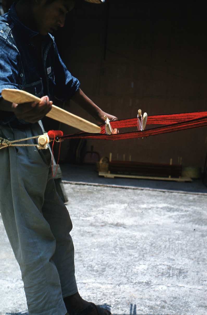 El bisnieto (ahijado) de Doña Lorenza, es originario de Mitla, Oaxaca, tiene catorce años de edad se encuentra de pie, tiene sujeto a la cintura un mecapal, el cual sostiene el telar de cintura, en la mano sostiene un tercer machete que está por introducir entre los hilos de urdimbre, espacio generado por otros dos machetes que se encuentran en posición vertical debajo de las varas de lizo. Diapositiva en buen estado de conservación.