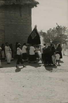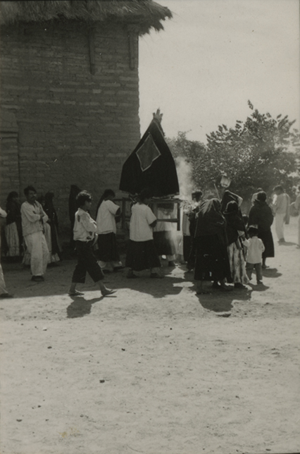 Procesión saliendo de la iglesia en San Juan Guivini, Oaxaca. Cuatro monaguillos cargan sobre sus hombros una plataforma, la cual lleva la imagen de la Virgen de la Soledad, la siguen sus feligreses. La iglesia es de adobe con techo de palma a dos aguas. Hoja de contacto pegada a una hoja de papel cartulina comercial, en buen estado.
