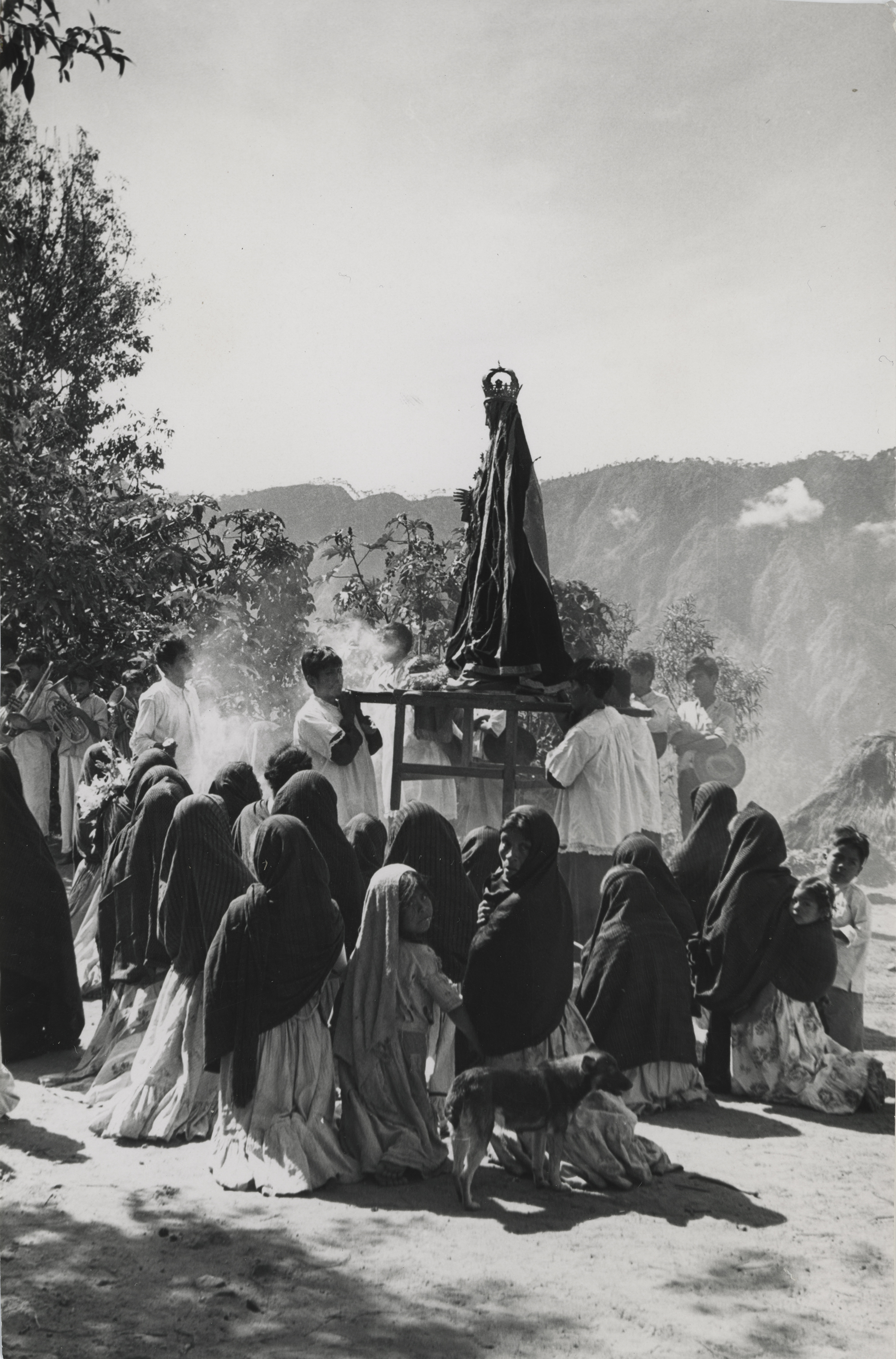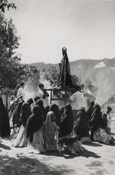 Durante la festividad en honor a la Virgen de la Soledad, la procesión hace paradas en las cuales los músicos tocan, los feligreses se hincan para rezar, se quema el copal, mientras los monaguillos sostienen en sus hombros la plataforma en la que llevan a la imagen. Hacen ofrecimientos con flores y maíz, los cuales se colocan a los pies de la virgen. La fotografía presenta rayones superficiales.