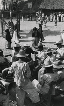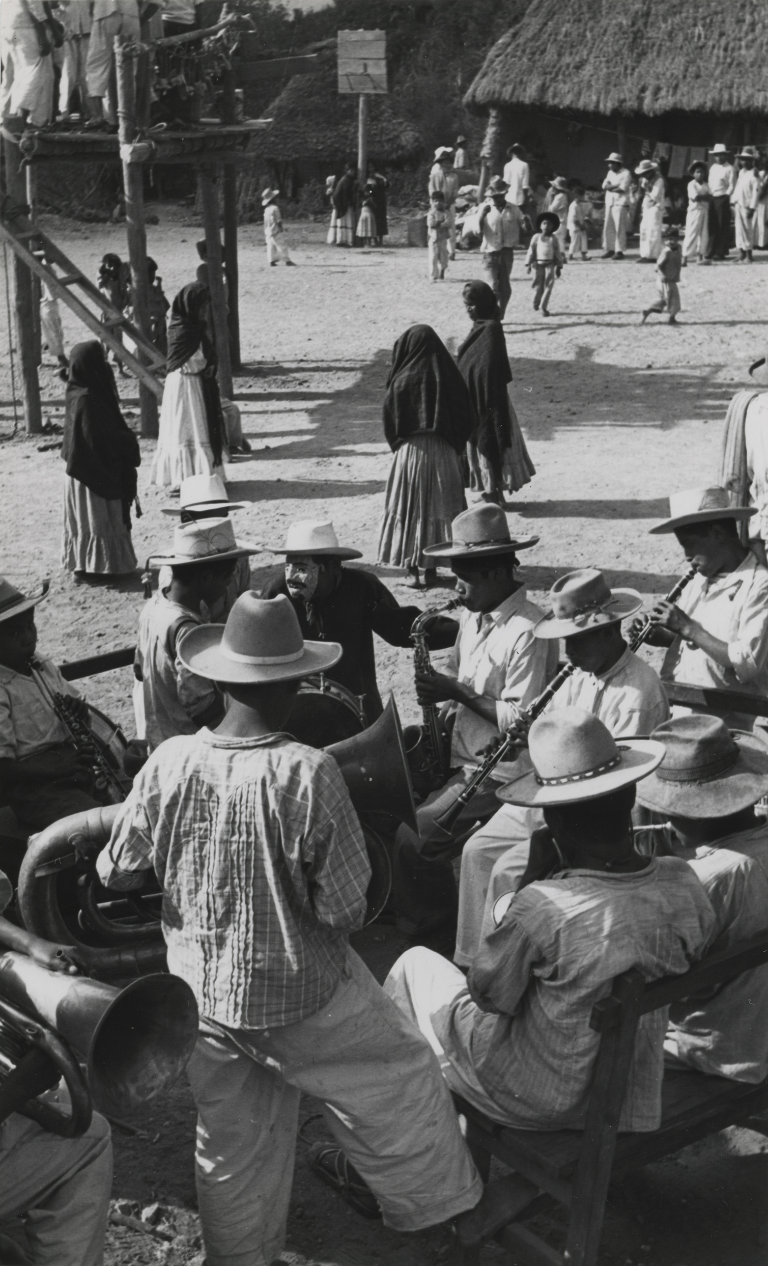 Banda de músicos tocando en la población de San Juan Guivini, Oaxaca, en la fiesta en honor a la Virgen de la Soledad, que se celebra en el mes de diciembre. Una persona porta una máscara, mujeres a un lado de un tapanco, al parecer bailando. Fotografía en buen estado de conservación.