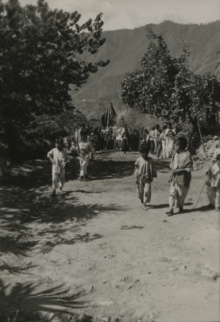 Procesión en honor a la Virgen de la Soledad, en la población de San Juan Guivini, Oaxaca. La imagen va sobre una plataforma, la cual es cargada por cuatro monaguillos, y es acompañada por músicos y feligreses. Hoja de contacto pegada a una hoja de papel cartulina comercial.