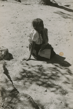 Mujer zapoteca de la población de San Juan Mixtepec, Oaxaca. Sentada sobre el suelo, viste un enredo (falda) de lana sujeto a la cintura con una faja y lleva un huipil (blusa) de algodón metido en el enredo, un lienzo le cubre el hombro izquierdo y sobre su regazo se observa un costalito. La imagen en hoja de contacto en buen estado, pegada a la hoja de papel cartulina comercial.