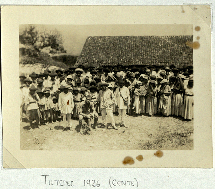 San Miguel Tiltepec situado en el Municipio de Ixtlán de Juárez, Mujeres, niños, hombres con vestimenta típica de la zona y un hombre de las expediciones. Registro de la expedición médica para la detección de la oncocercosis en la Sierra Norte de Oaxaca.
