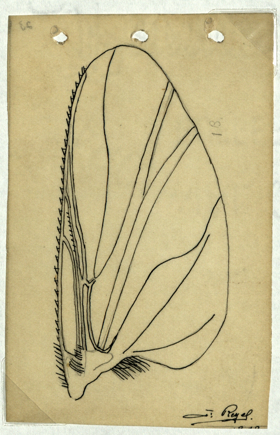 1 dibujo: rectangular, orientacion vertical tinta negra a renglón seguido, 6.8 x 10.6 cm., perforaciones en la parte superior, buen estado de conservación.