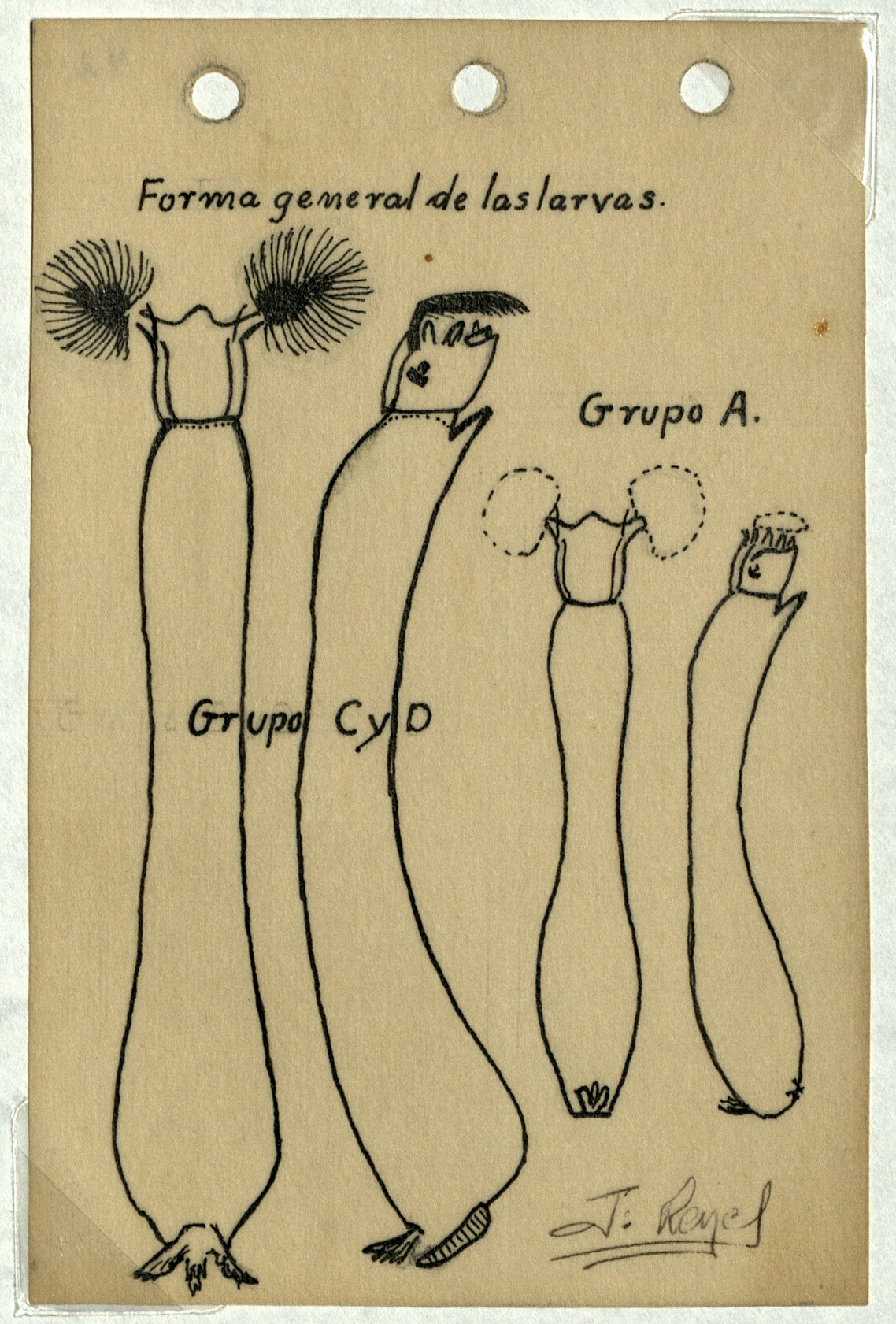 Comparación de la forma de las larvas grupo C-D y grupo A, contiene firma del autor. Compaña contra la oncocercosis y mal del pinto en la Sierra Norte de Oaxaca.