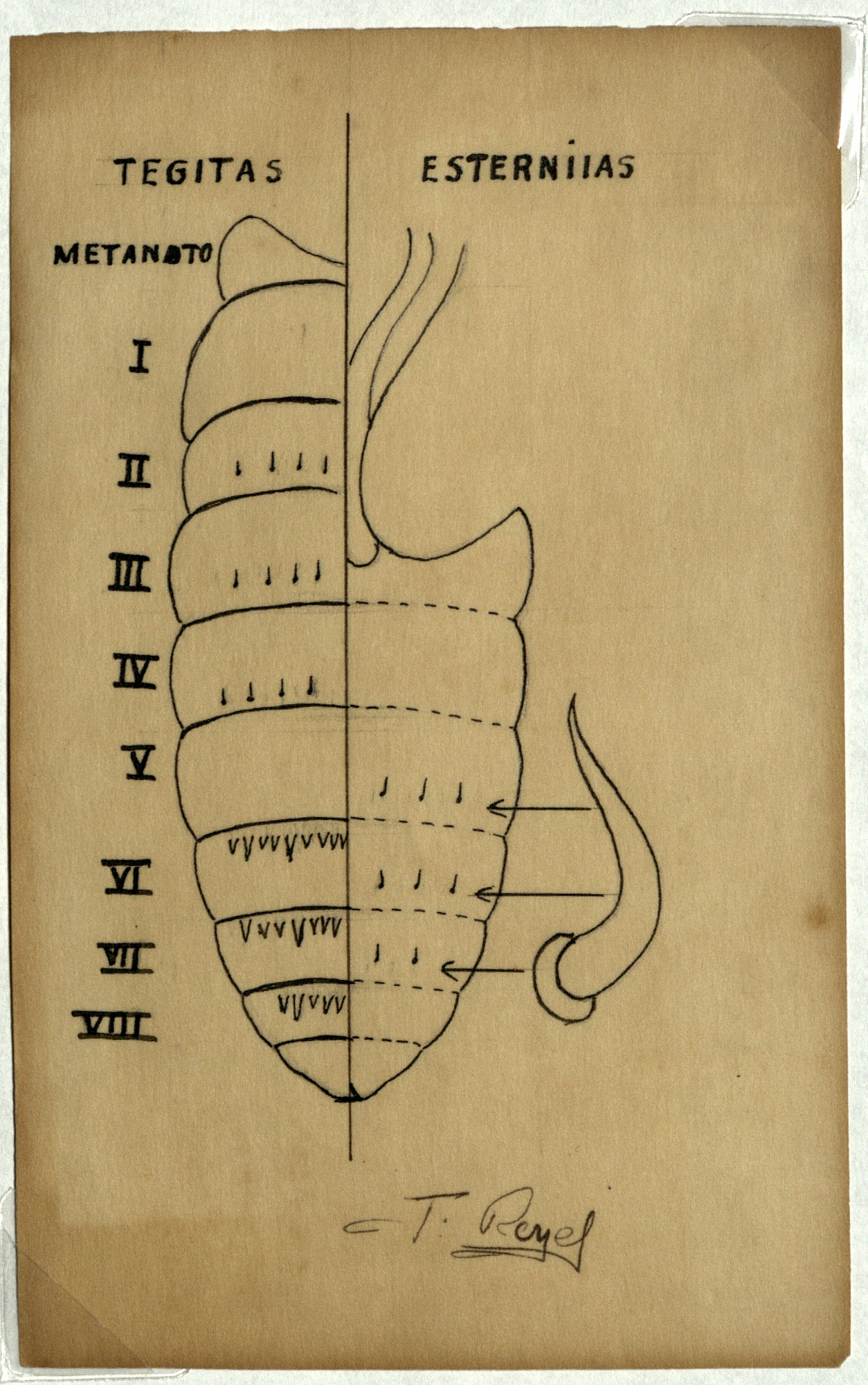 Dibujo de abdomen vista frontal, donde describe las tegitas, estermitas, metanato y sus 8 secciones, contiene firma del autor. Compaña contra la oncocercosis y mal del pinto en la Sierra Norte de Oaxaca.